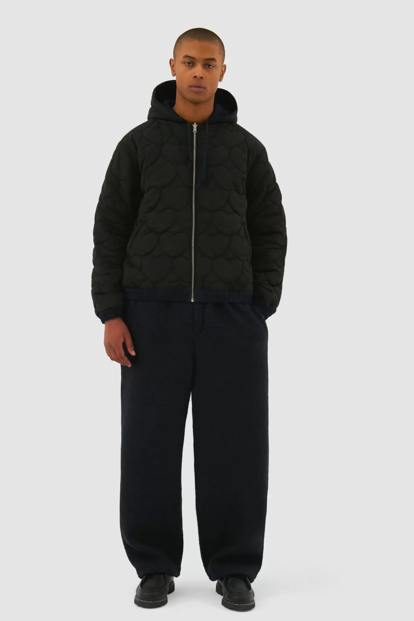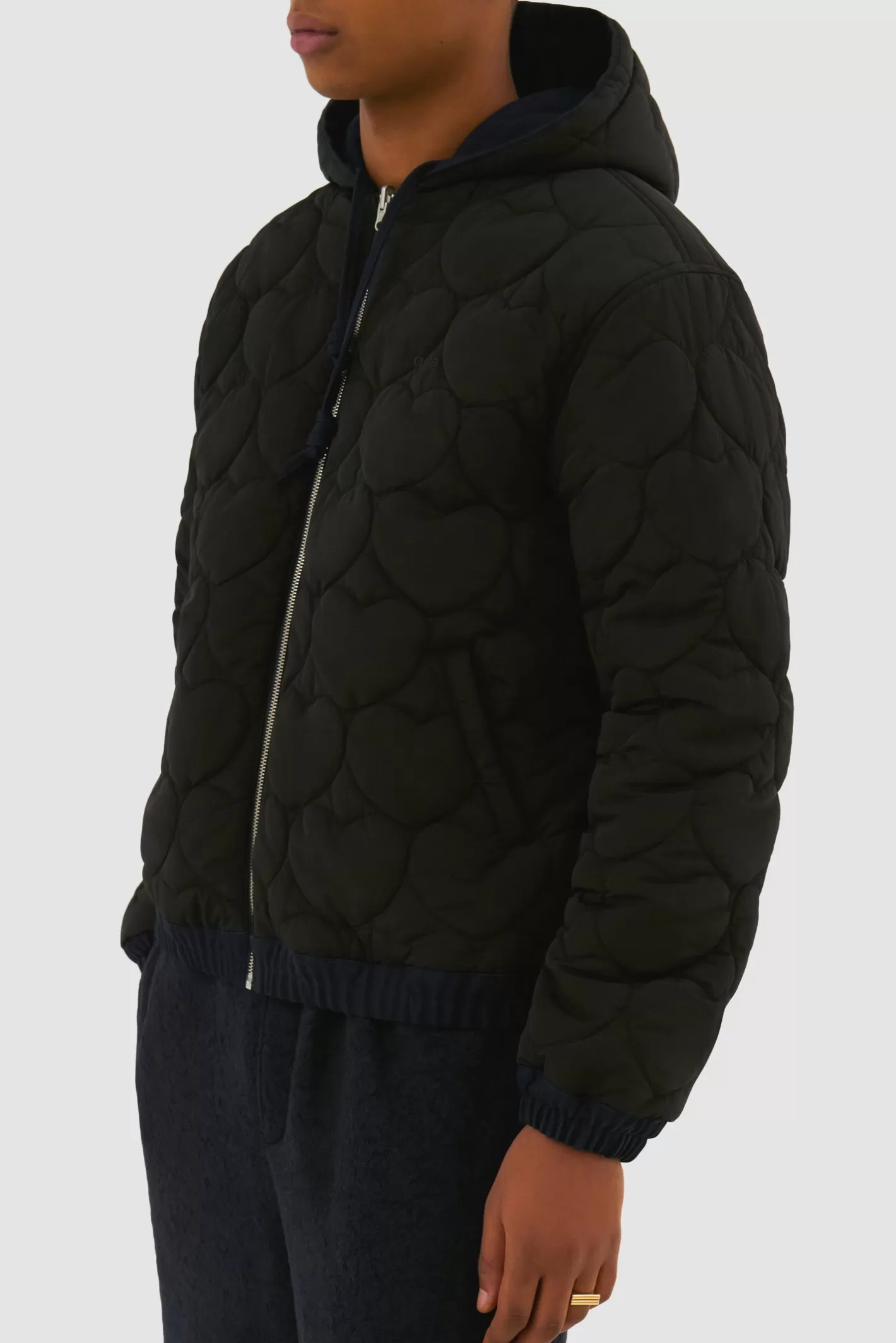 The Reversible Hooded Jacket in navy offers two distinct looks. One side is crafted from durable cotton, while the other showcases our signature heartshaped padded nylon design. Both sides are detailed with a tonal embroidered logo on the left chest. The jacket is finished with a fulllength zipper, elasticated waistband and cuffs, and adjustable hood drawstrings for a customized fit.