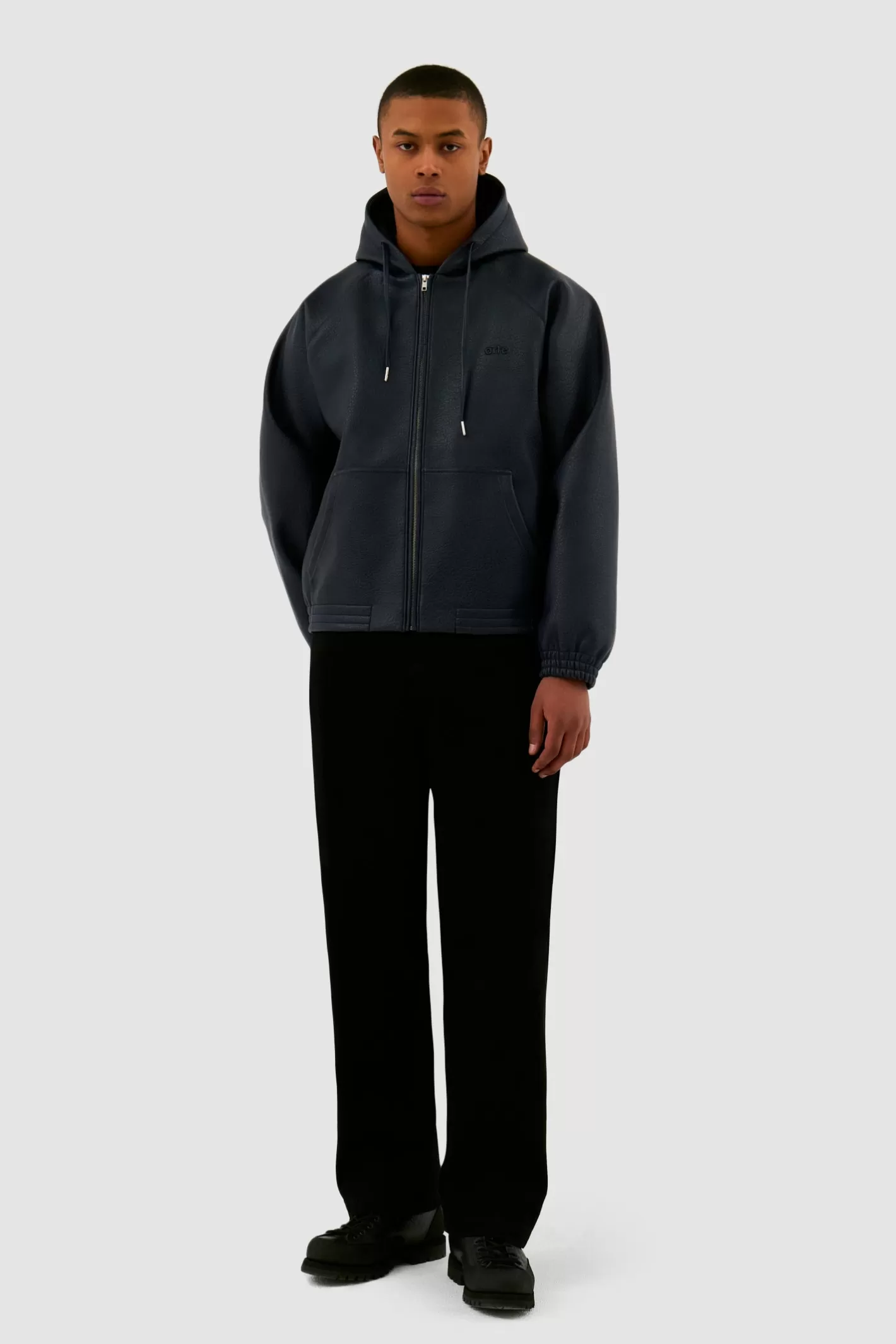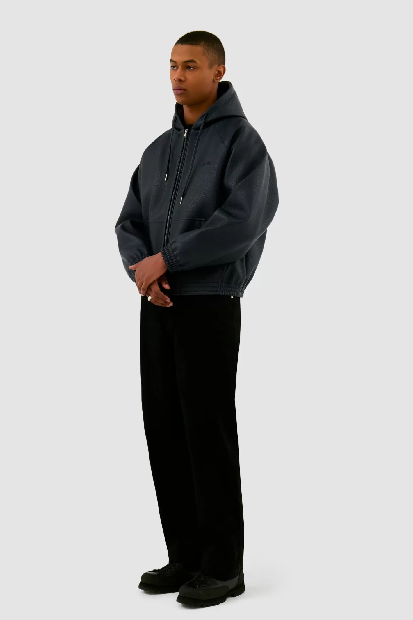 The Leather Hooded Jacket in navy is an elevated take on an everyday jacket. Made from premium faux leather, the jacket comes in a relaxed fit and is finished with two pockets, drawstrings, and a fulllength zipper. The Arte logo can be found embossed on the left side of the chest.