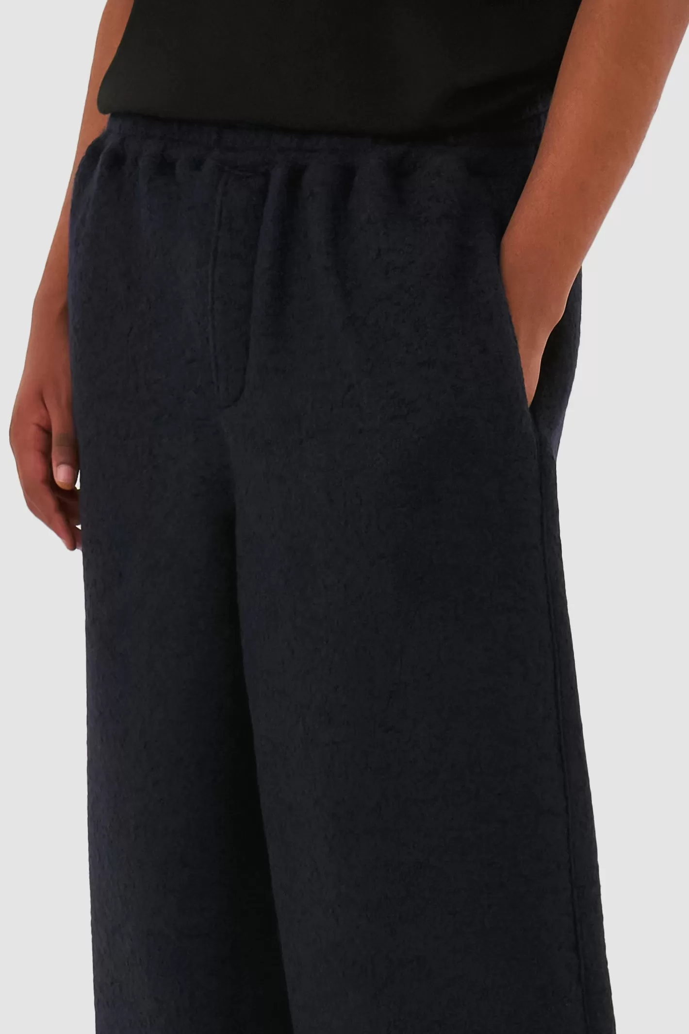 The Boiled Wool Pants in black seamlessly blend style with comfort. Made from premium boiled wool, they feature two side pockets, a fake zip fly and an elastic waistband for the perfect fitting. The wide fit ensures both comfort and ease of movement. Finished with a tonal embroidery on the left leg.