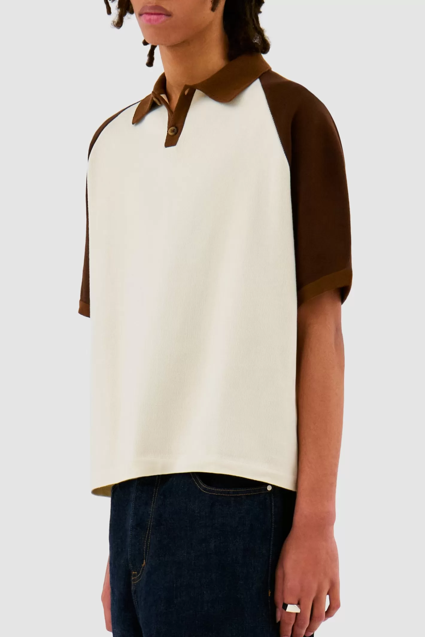 The Baseball Knit comes in a cream shade with contrasting brown sleeves and collar. Made from premium cotton, this knit shirt is both breathable and comfortable. It features a classic buttoned placket.