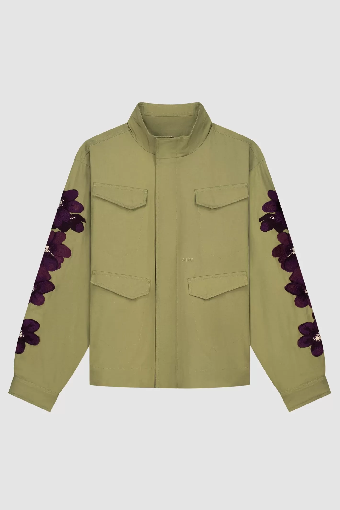The Flower Embroidery Jacket in olive green offers a seasonal twist on a utilitarianstyle jacket. Made from premium cotton, this jacket has a relaxed fit with a raised collar. It features four front pockets and a concealed zipper placket. The sleeves are adorned with a flower embroidery design.